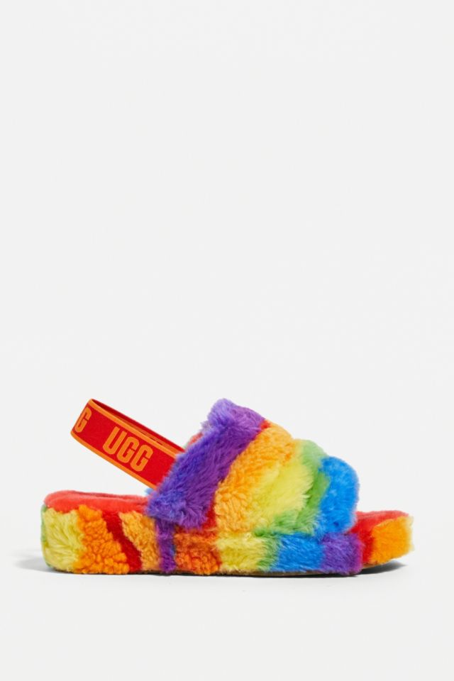 Ugg X Pacific Pride Foundation Rainbow Fluff Yeah Cali Collage Slide Sandals Urban Outfitters Uk
